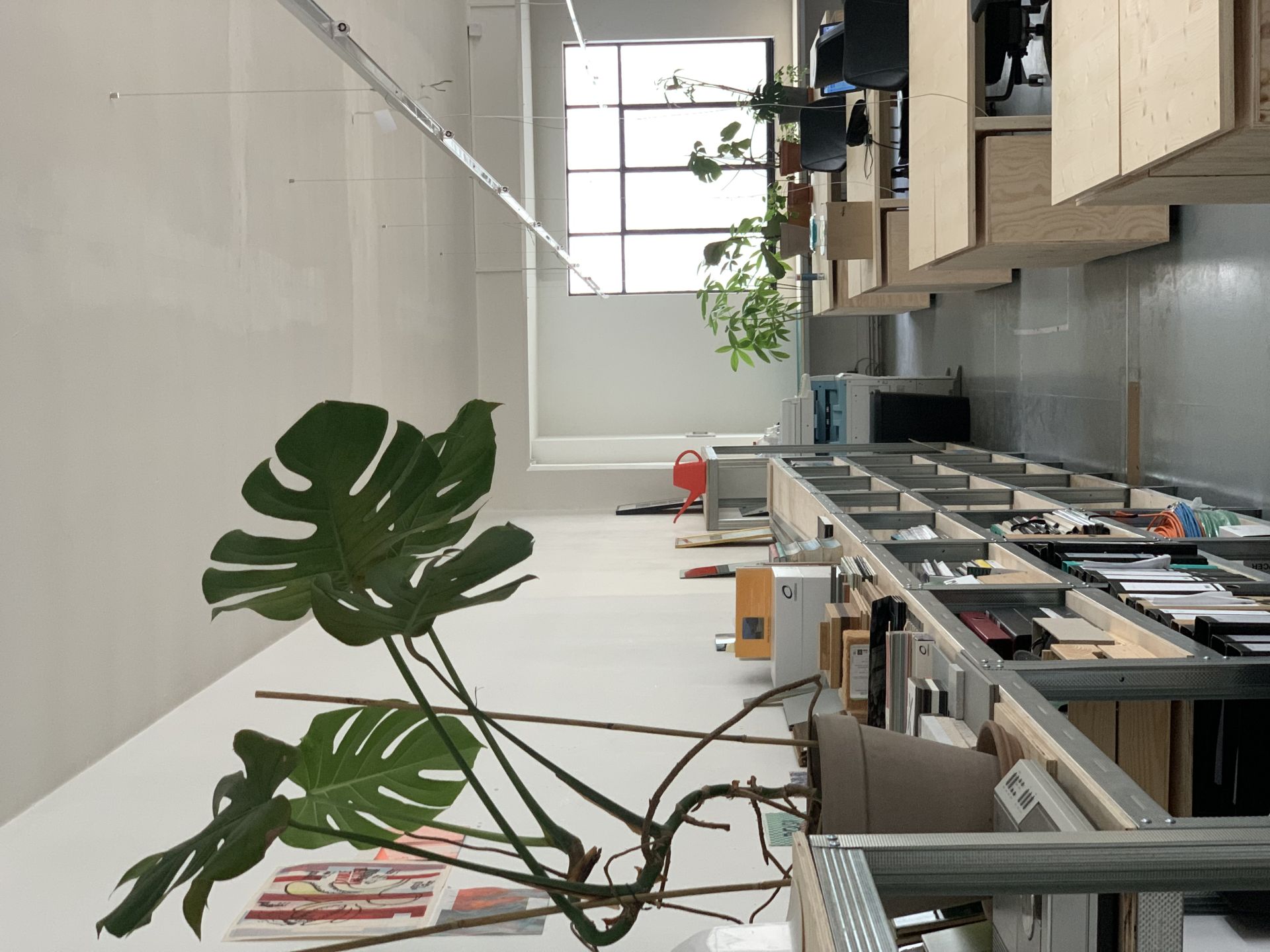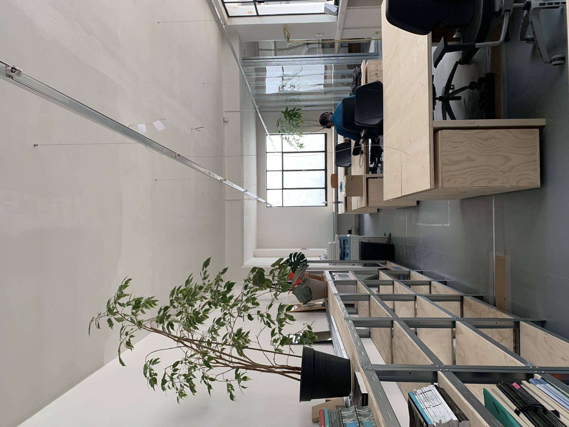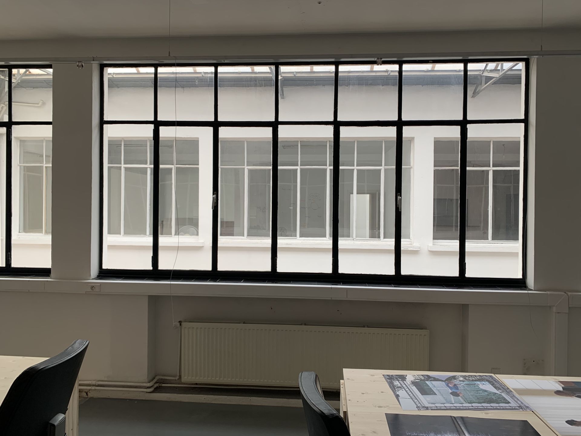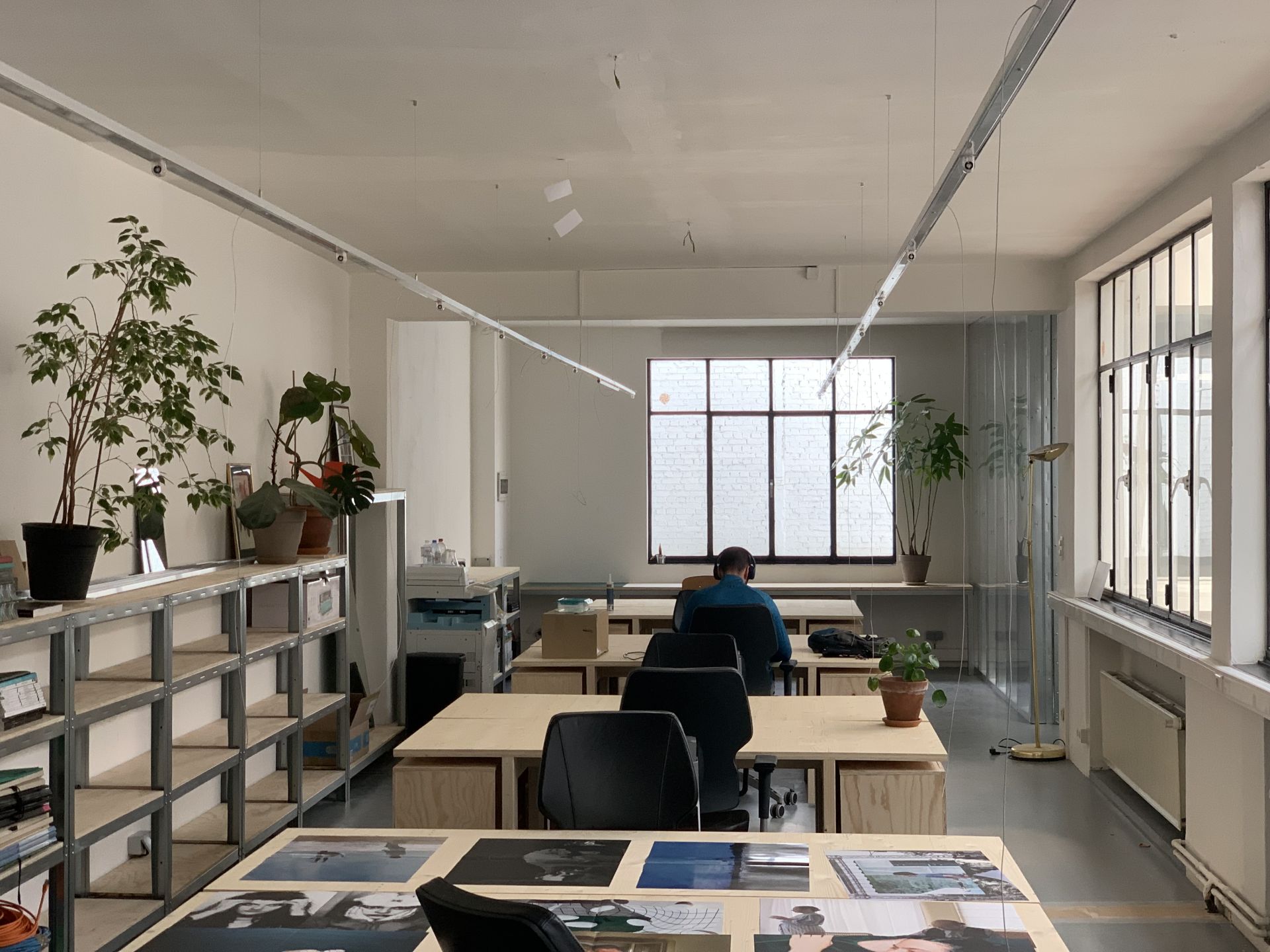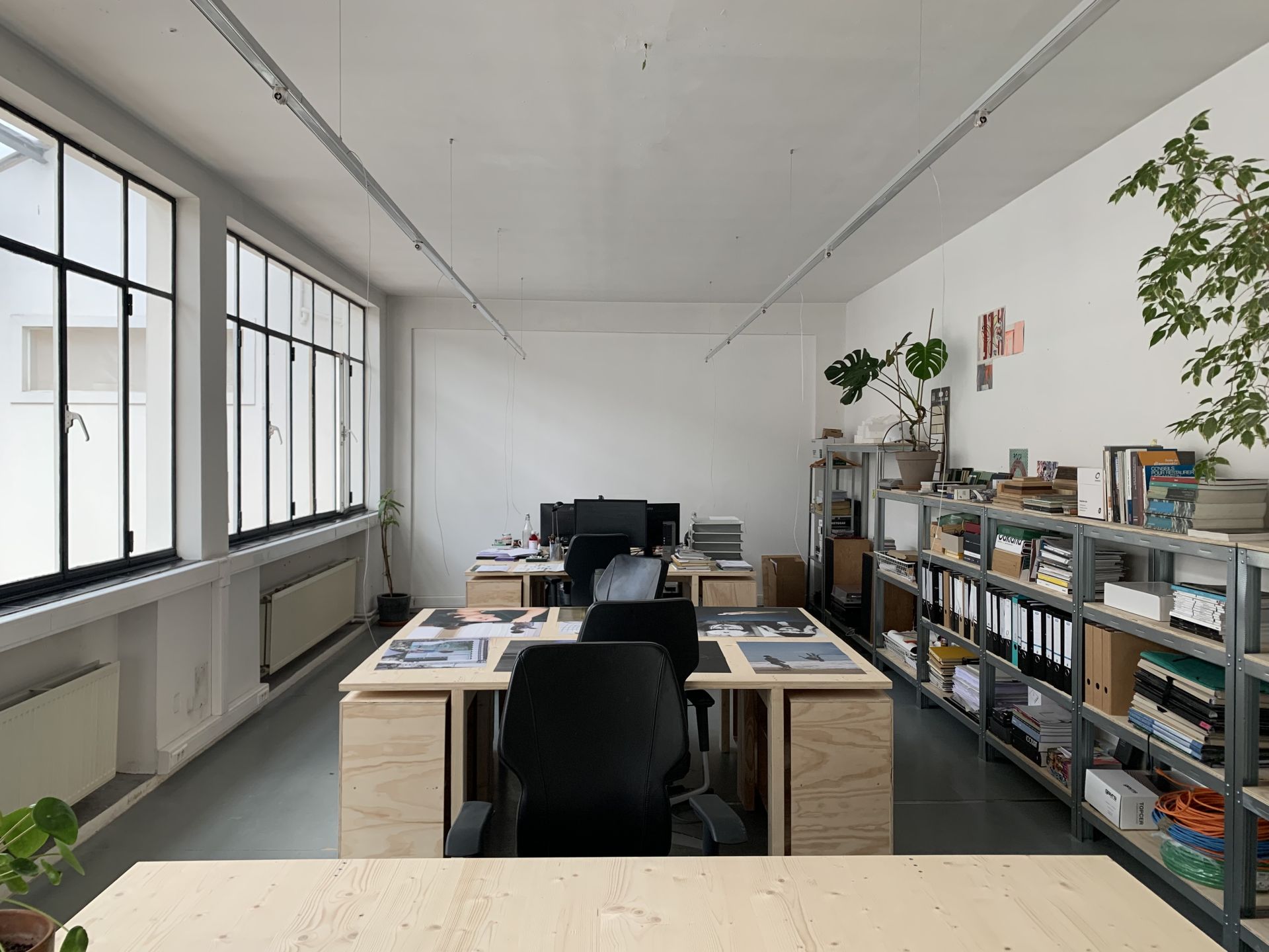 The workspace located in a former art gallery. The main room overlooks the building's central patio, bathed in natural light.