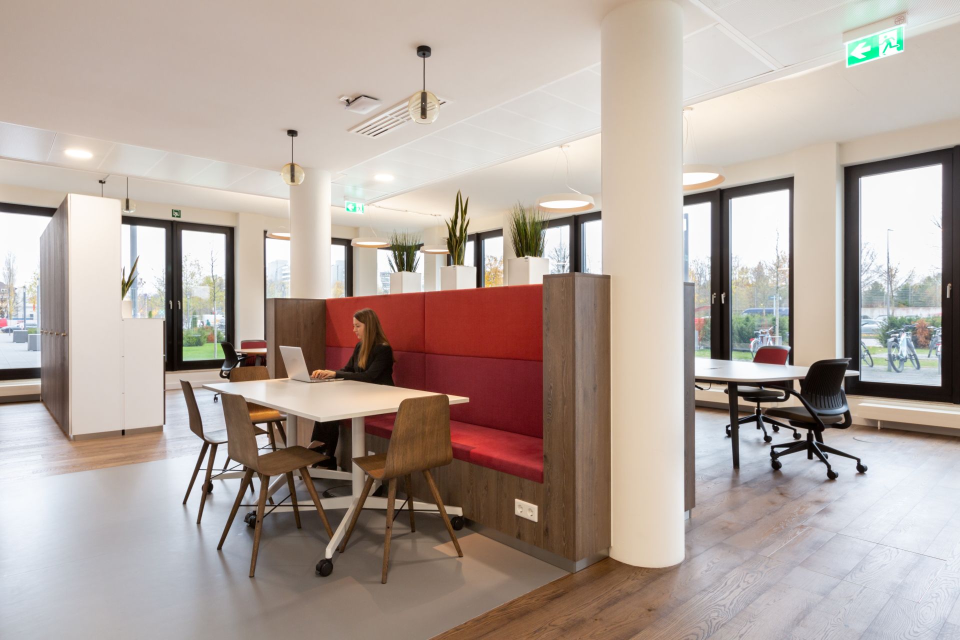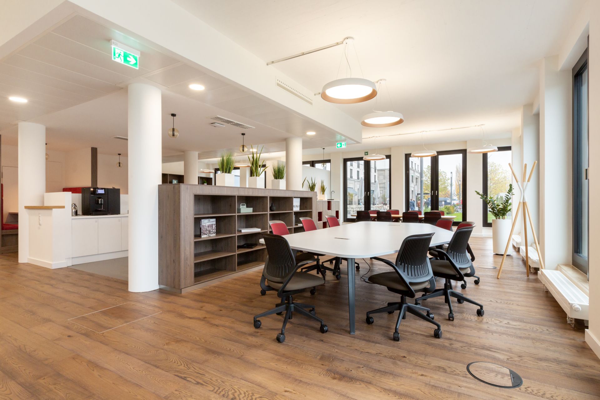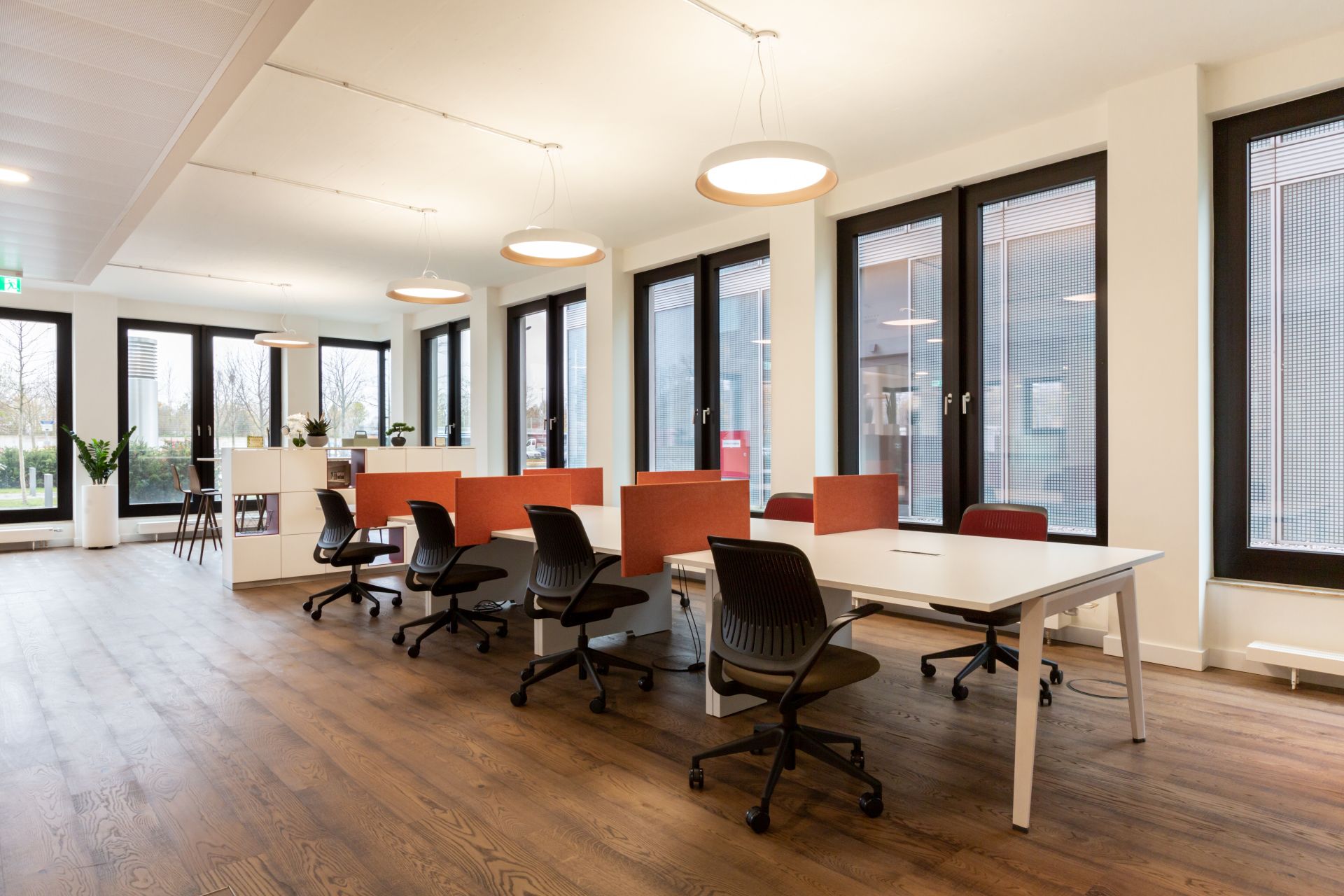 Moosacher Straße 82a, ground floor, 1st, 2nd, 3rd floor, 80809 Munich, This new building is located in a quiet suburb, which also houses the Olympic Park, and is easily accessible from Munich city center. Mo82 convinces by its excellent location on the one hand and its breathtaking views of greenery on the other. The flexible and fully equipped workspaces are located on the first four floors of the building, are adaptable to your needs and are guaranteed to increase your productivity. The floor-to-ceiling windows provide plenty of natural light. Here you will find the perfect environment to think about your next big idea, whether in private offices, coworking areas or conference and meeting rooms for rent in Munich.