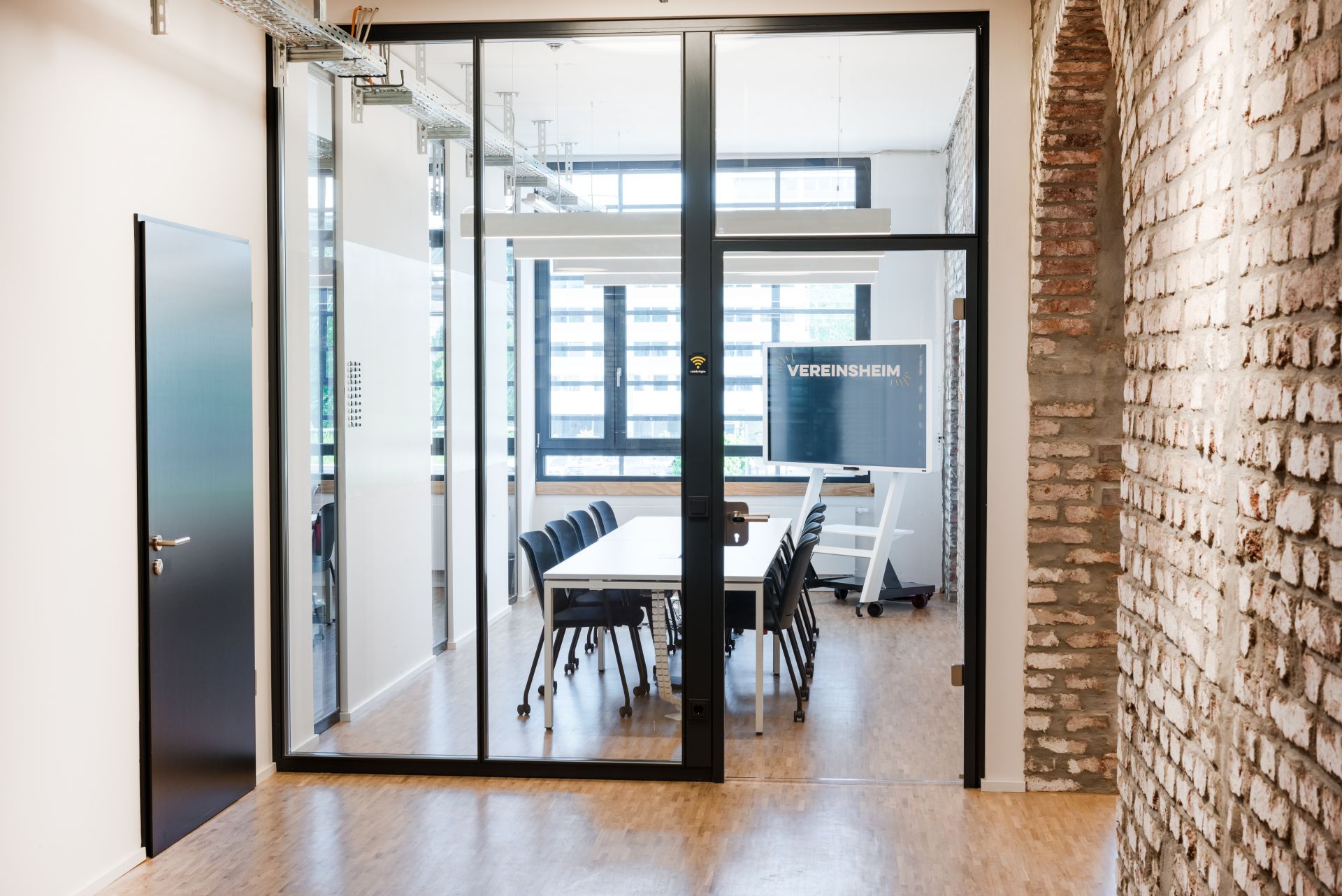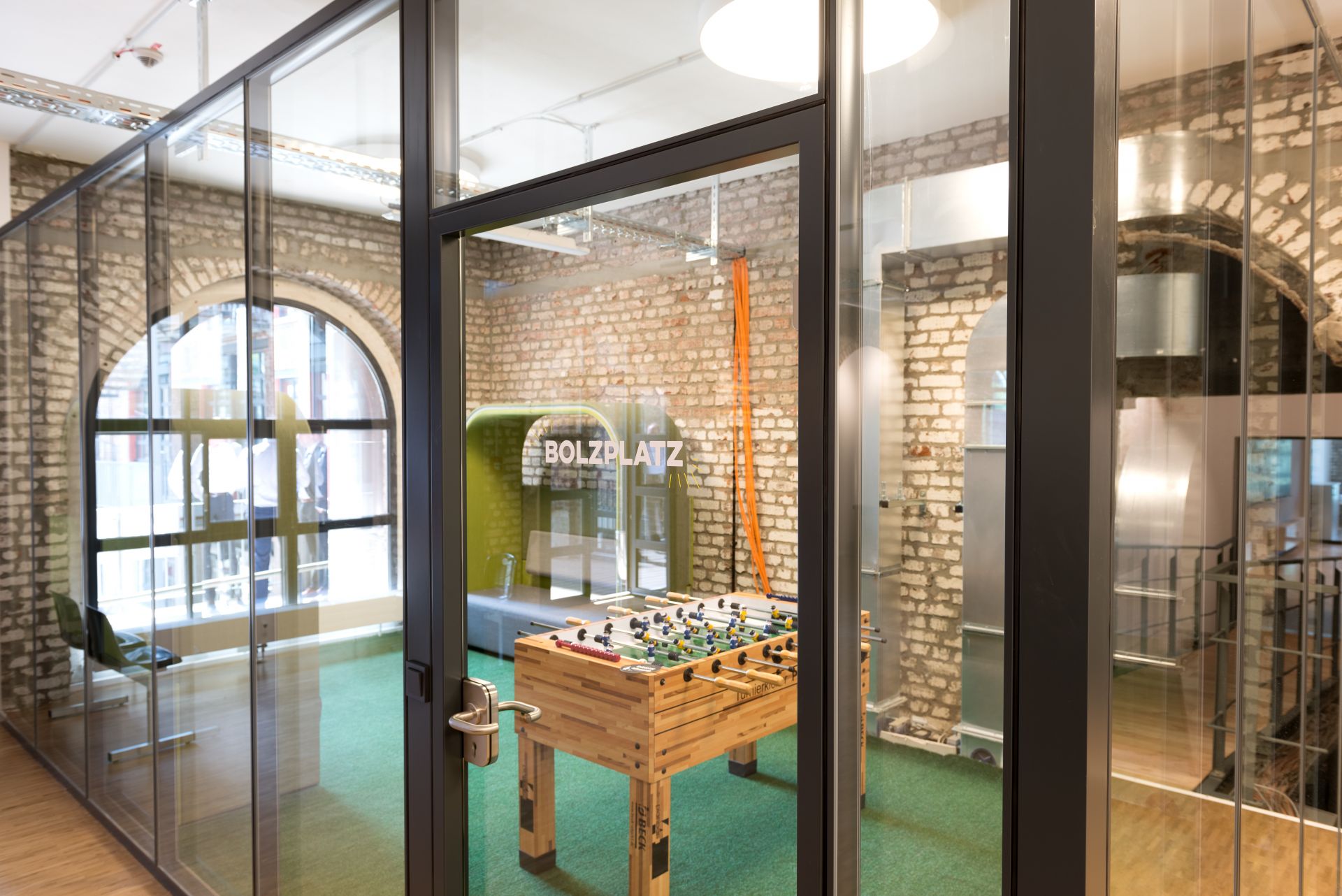 Coworking Arbeitsplätze findest du im 1. OG auf vier Zonen: dem Wohn- und Arbeitszimmer sowie der Bücherei. In der Trinkhalle steht der Kicker im Bolzplatz. Das Vereinsheim und der Meet'n' Greet bieten Platz für Besprechungen und Canvas hat eine komplette magnetische Whiteboardwand. Digitale Whiteboards kannst du nach Bedarf buchen.
