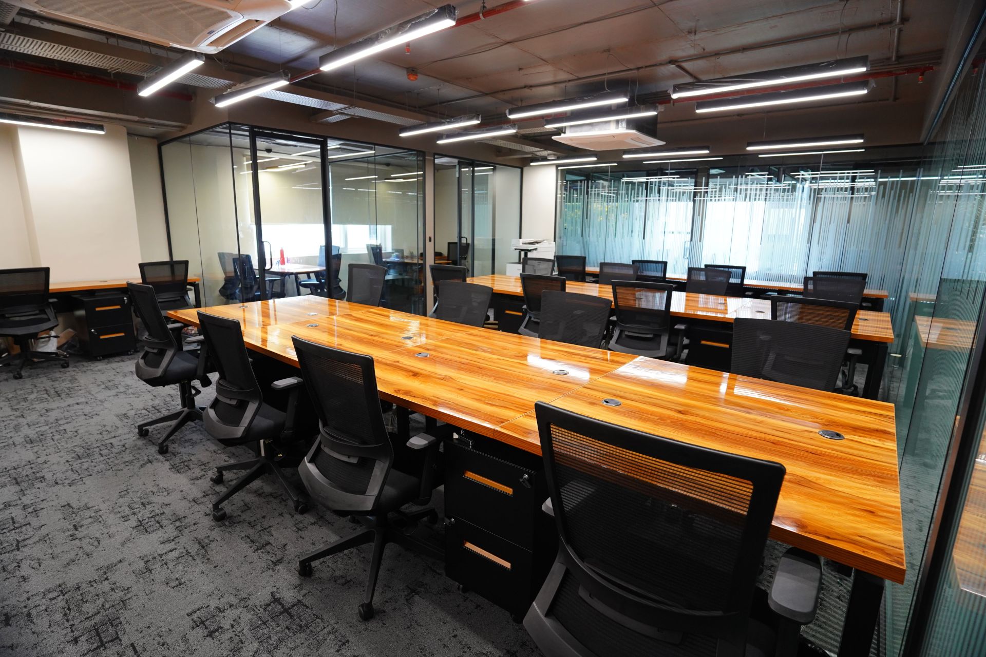 The space is furnished with a mix of ergonomic chairs, desks, and tables that are designed to support a variety of work styles. There are also comfortable lounge areas, meeting rooms, and private phone booths to provide different work environments based on individual preferences.