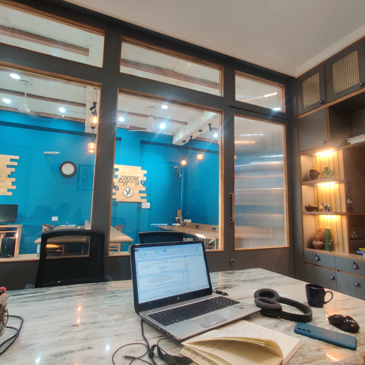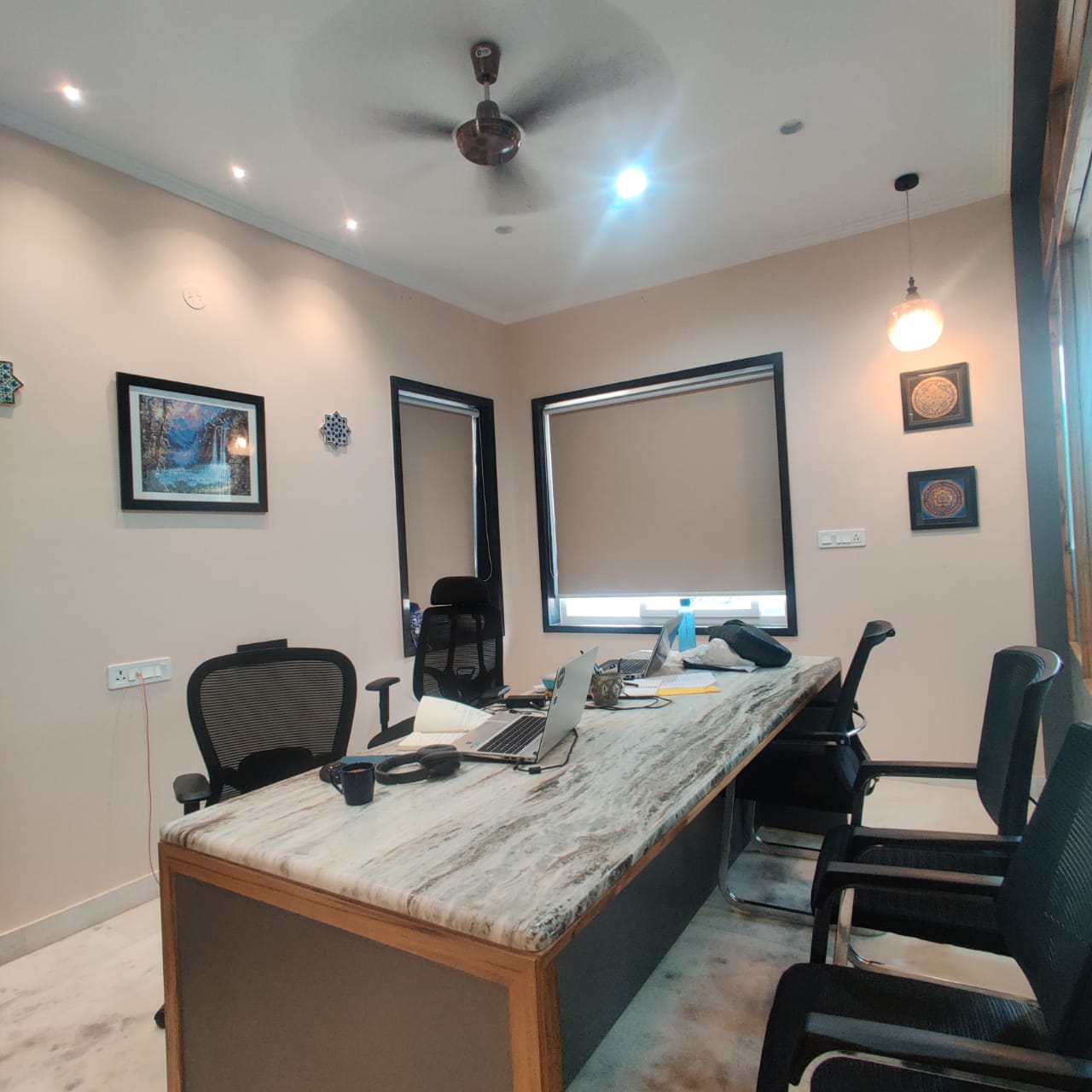 A co-working studio with an artsy vibe. With ample space for parking and quaint surroundings, we offer you an open studio to work and interact. The cabins offer a more professional and formal sitting and meeting space.