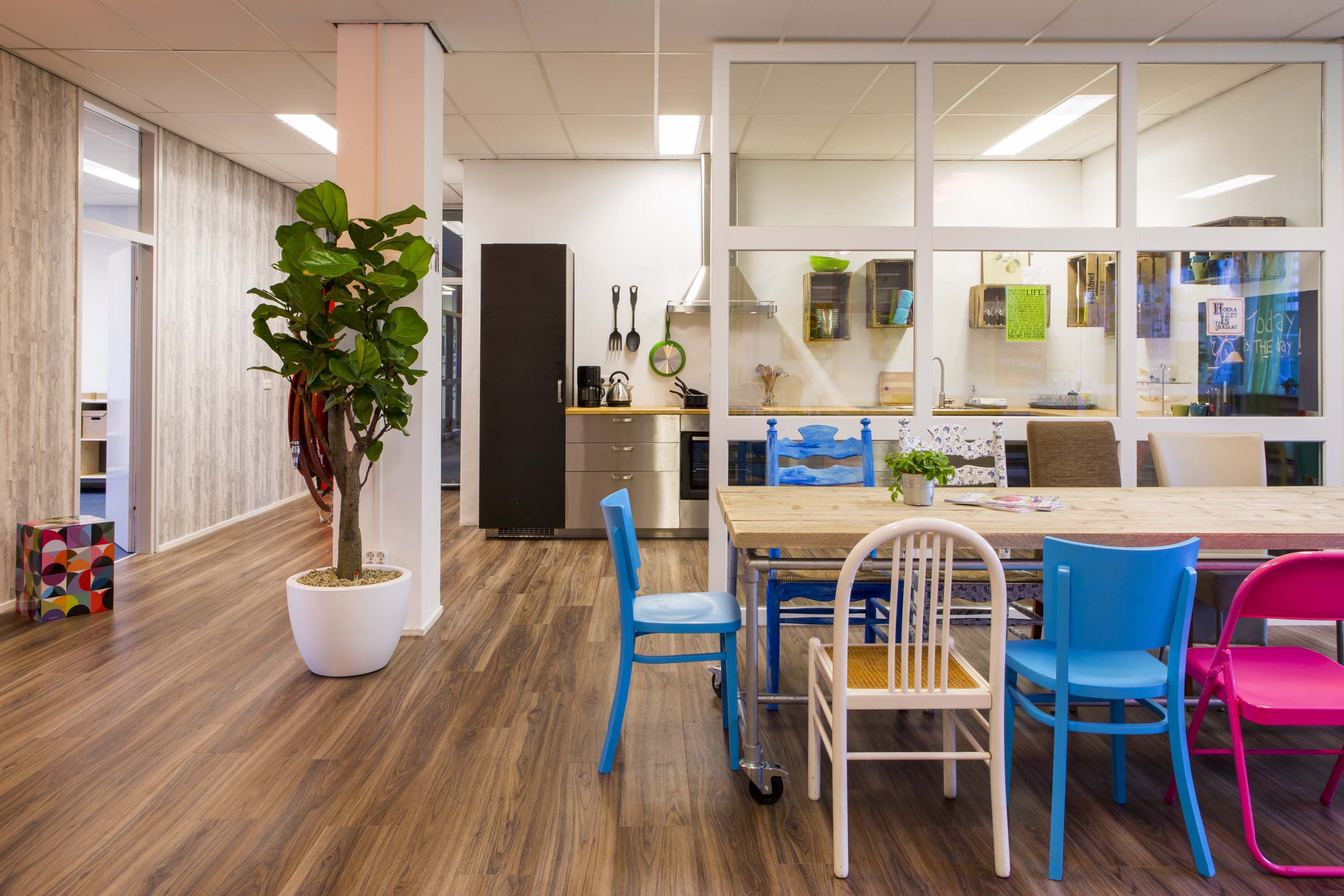 Dé Plek Haarlem is perfect for entrepreneurs who are looking for a professional and inspiring workspace. The building has three floors of meeting rooms, coworking spaces and offices. The mix of entrepreneurs, from starters to people with years of experience, contribute to a very vibrant work environment. In the coworking space you work together with other entrepreneurs on large tables.
