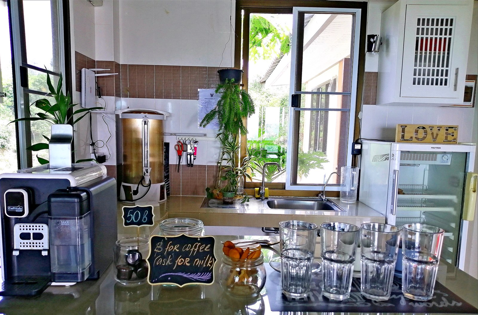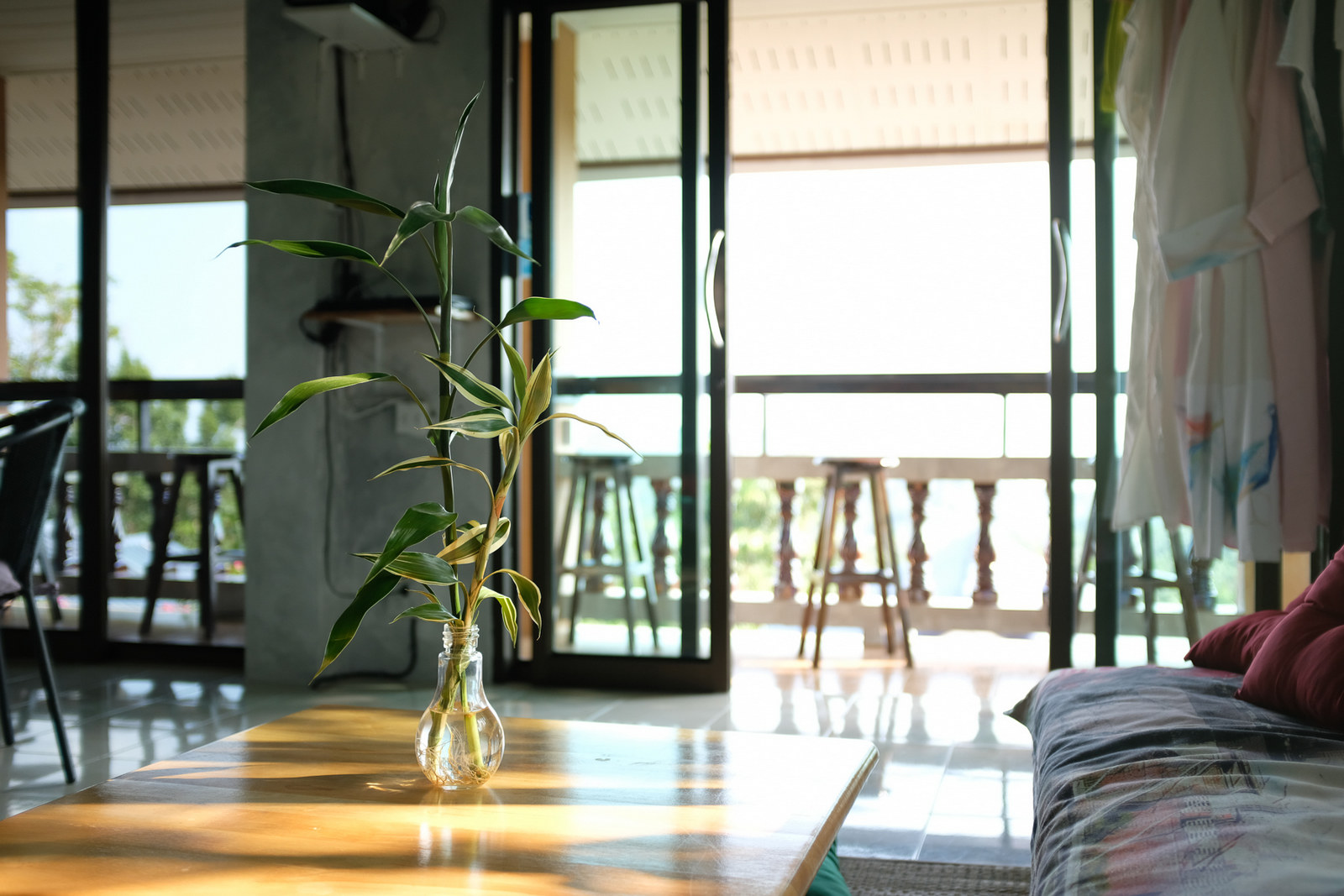 Fast wi-fi, aircon ❄, coffee, breakfasts & vegetarian snacks, a projector, sound system, many plugs, balcony with a bar counter and a crazy island view.