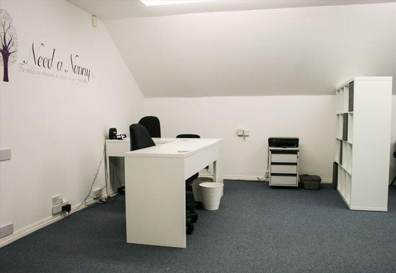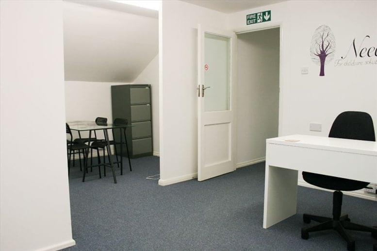 Recently painted office space for five+ people with board room and seating areas. Comes with parking, shared w.c and well-equipped kitchen which includes a fridge, microwave, toaster, crockery and utensils. Utility bills and rates included in the price. The office comes unfurnished with newly painted white walls and blue hard-wearing carpet. The office has its own front door and is private.