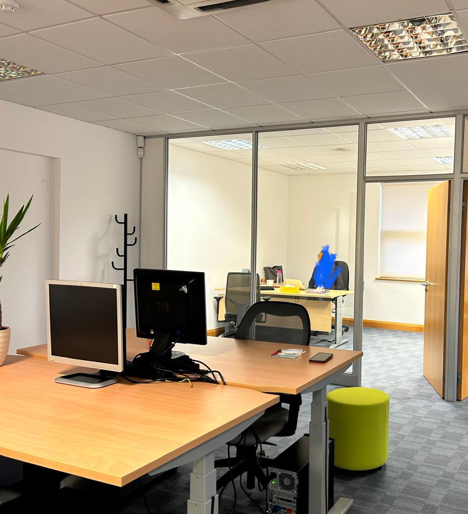 Coworking office desks available in a modern, two storey detached office building; has got first floor shared office space available with six desks (nearly 500sq.feet). ; . The building, built in 2007, is of steel frame construction with brick elevations under a pitched steel profile clad roof. The lobby area provides WC provisions, one 4 person passenger lift and a stairwell leading up to the first floor accommodation. Internally, the premises comprises mainly open plan office accommodation with partitioned offices and kitchenette.